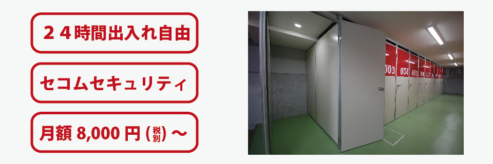 | Q1、トランクルームを内覧することはできますか? A1、事前に予約を入れて頂き、内覧することが可能です。 Q2、搬入・搬出の時間は決まっていますか? A2、24時間365日、いつでも可能です。 Q3、収納してはいけないものはありますか? A3、貴重品、動植物、危険物、異臭・悪臭のする物品、水分や高温を発する物品、発火性、引火性のある物品等はお断りしております。 Q4、契約時に何が必要ですか? A4、個人のお客様:身分証明書の写し(運転免許証、パスポート、住基カード等)・ご印鑑、法人のお客様:登記簿謄本・ご印鑑 Q5、最短何ヶ月から借りることが可能ですか? A5、最短1ヶ月からご利用可能です。 Q6、トランクルームに住めますか? A6、トランクルームは住居ではありませんので、住めません。 Q7、ペットを飼うことはできますか? A7、いかなる種類の生き物においても飼うことはできません。 Q8、電源はありますか? A8、トランクルーム内に電源はございません。 Q9、管理人はいますか? A9、管理人はおりませんが、スタッフが定期的に巡回しております。 Q10、保管品の注意事項はありますか? A10、1. 衣類(着物)はクリーニングした後に、衣装ケース等に入れ、乾燥剤・防虫剤を入れて収納することをお勧めします。 2. アウトドア用品は、よく乾かしてから収納することをお勧めします。 3. 革製品はこまめなお手入れが必要です。お客様個々での管理をお願いします。 4. 荷物はスノコを活用するなどし、隙間を空けて収納することをお勧めします。 TOPへ戻る |
